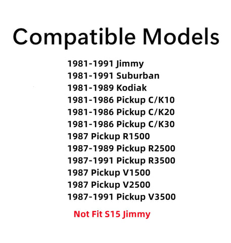- Compatible Models : 1981-1991 Blazer (Not For S10 Blazer) , 1981-1991 Suburban , 1981-1989 Kodiak , 1981-1986 C-Series (C10 , C20, C30, K10, K20, K30) Pickup , 1987-1991 R-Series (R20 , R30 , R2500) Pickup , 1987-1991 V-Series (V10, V10, V20, V30, V3500) Pickup