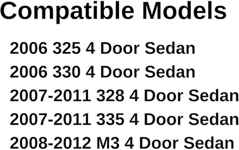 - Compatible Models: 2006 325 ( 325i 325xi ) 4 Door Sedan , 2007-2011 328 ( 328i 328xi) 4 Door Sedan , 2006 330 ( 330i 330xi ) 4 Door Sedan , 2007-2011 335 ( 335d 335i 335xi ) 4 Door Sedan , 2008-2012 M3 4 Door Sedan