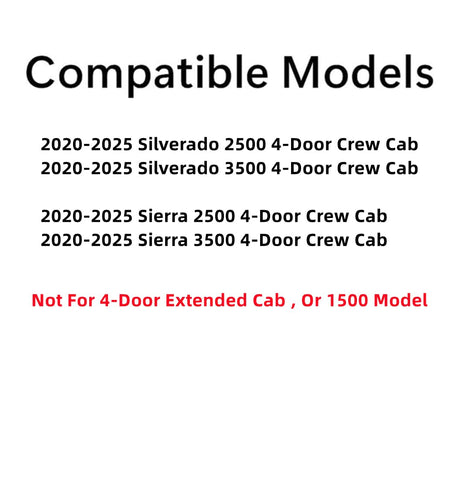 - Compatible Models : 2020-2025 Silverado 2500 HD 4 Door Crew Cab , 2020-2025 Silverado 3500 HD 4 Door Crew Cab , 2020-2025 Sierra 2500 HD 4 Door Crew Cab , 2020-2025 Sierra 3500 HD 4 Door Crew Cab