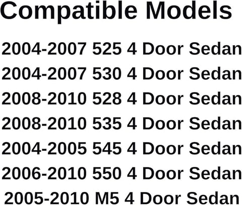 • Compatible Models: 2008-2010 5-Series ( 528i , 528i xDrive, 525i , 525i xDrive, and 535i ) 4 Door Sedan , 2006-2010 550i 4 Door Sedan , 2005-2010 M5 4 Door Sedan