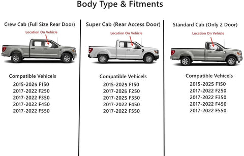 - Compatible Models: 2015-2025 F150 Fits all body type, 2017-2022 F250 Fits all body type, 2017-2022 F350 Fits all body type, 2017-2022 F450 Fits all body type, 2017-2022 F550 Fits all body type, 2023-2025 F250 4 Door Super/Extended Cab, 2023-2025 F350 4 Door Super/Extended Cab