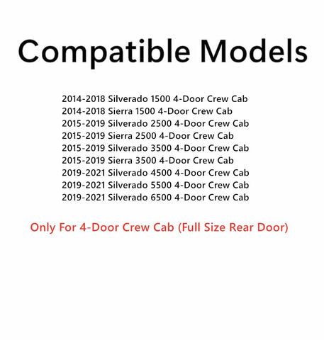 - Compatible Models: 2014-2018 Silverado 1500 4 Door Crew Cab, 2015-2019 Silverado 2500/3500 4 Door Crew Cab, 2019-2021 Silverado 4500/5500/6500 4 Door Crew Cab, 2014-2018 Sierra 1500 4 Door Crew Cab, 2015-2019 Sierra 2500/3500 4 Door Crew Cab, 2019 Sierra 4500/5500/6500 4 Door Crew Cab
